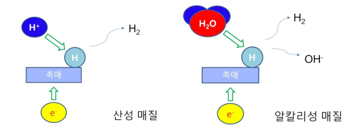 반면 아래 그림과 같이, 이미 흡착된 수소 원자 자체에 직접 다른 H+나 물 분자가 붙어 수소 분자가 탈착하는 경우, 이를 Heyrovsky 반응이라고 한다.