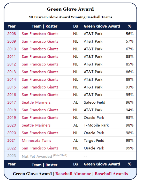 이러한 구단의 친환경 경영을 장려하기 위해 MLS는 매년 ‘Green Glove Award (그린 글러브 어워드)’ 시상식을 개최하고 있다. ‘Golden Glove Award (골든 글러브 어워드)’가 한 해 동안 최고의 수비를 펼친 선수에게 주어지는 상이라면, 그린 글러브 어워드는 한 해 동안 가장 친환경적으로 구단을 운영한 팀에게 주어지는 상이다. 이 시상은 2008년부터 지속되어 오고 있으며 평가 기준은 ‘경기장 내 쓰레기 재활용 비율’이다. 덕분에 팀의 승점 / 순위 경쟁만큼이나 녹색 경영에도 치열한 경쟁이 이어져 오고 있으며, 그 결과 2008년 평균 30% 정도를 보인 각 구단의 재활용 비율이 2021년 우승팀 ‘미네소타 트윈스’와 2022 우승팀 ‘샌프란시스코 자이언츠’ 기준 99%까지 치솟았다. 이외에도 MLS 내 모든 구단이 미국의 친환경 건물 제도인 LEED를 따르며 전기 에너지 효율을 높이는 긍정적인 모습도 관찰되었다.