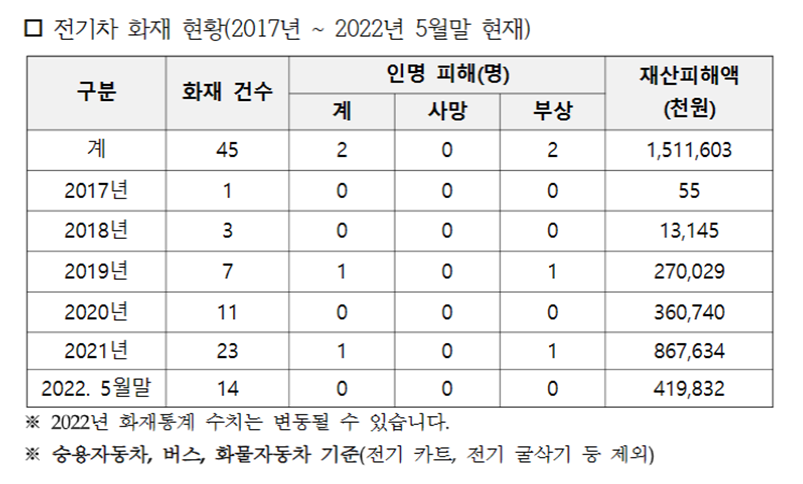 그러나 전기차 수가 늘어남에 따라 화재사고 역시 늘고 있어 전기차 안전에 대한 우려가 커지고 있다. 소방청 전기차 화재 현황 자료에 따르면, 2017년부터 2022년 5월 말까지 국내에서 총 45건의 전기차 화재가 발생했다. 특히 매년 화재 건수가 늘어남에 따라 재산피해액도 늘고 있다는 점에 주목할 필요가 있다.