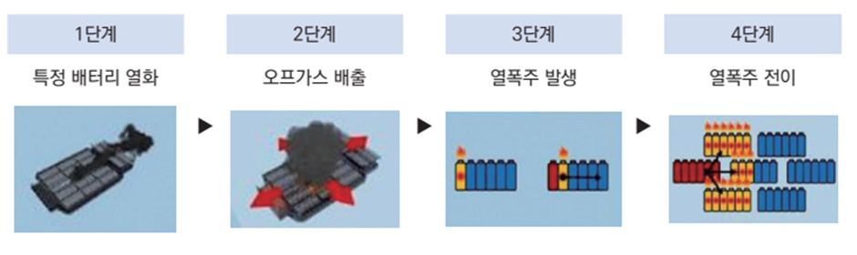 특정 배터리 셀의 열폭주로 주변 배터리 셀에 연쇄적으로 발화가 유도된다.