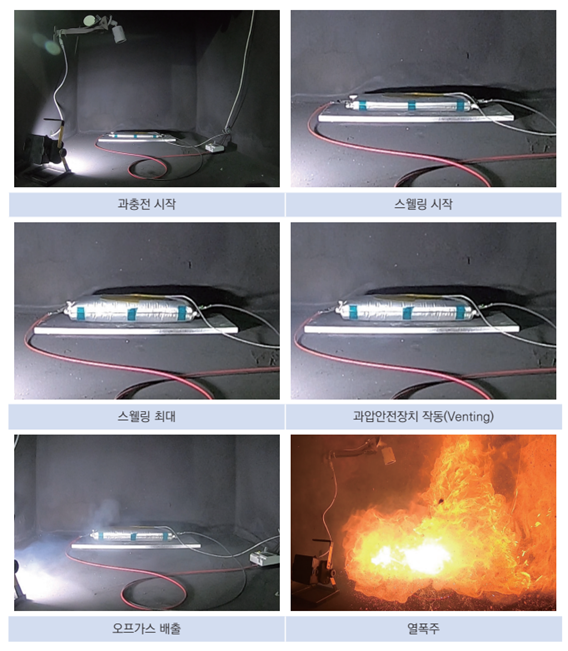 위 사진은 실제로 열폭주를 유도하기 위해 리튬이온전지에 과충전을 실시한 모습이다. 과충전으로 인해 내부 압력이 증가해 배터리가 팽창하는 스웰링이 발생했고, 이후 과압 안전장치가 작동했다. 하지만 내부 압력이 계속 증가하자 결국 오프가스가 발생해 열폭주 현상으로 이어졌다.