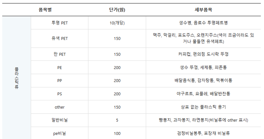 크게 플라스틱류, 종이류, 섬유류, 병류, 캔류를 분리수거할 수 있으며, 자세한 단가 및 세부품목에 대해서는 미추홀구 사이트에서 확인 가능하다.