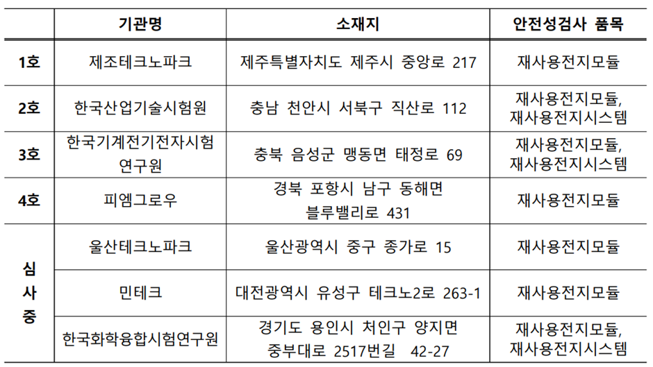 국가기술표준원은 2023년 7월부터 안전성검사기관 지정을 위해 사전접수를 받았다. 이때 신청기관은 사업계획서 및 업무규정 등의 문서심사와 현장평가를 거친 후 「전기용품 및 생활용품 안전관리법」에 따라 심의를 통해 안전성검사기관으로 지정되었다. 현재 전국적으로 재사용전지 안정성검사기관이 지정된 가운데, 제1호는 ‘제주테크노파크’가 선정되었다. 제주테크노파크에서는 2023년 11월 17일부터 재사용전지 및 전후방 연관 사업자를 대상으로 사업공고를 내고, 재사용전지 안전성검사 지원서비스를 시작했다. 이를 통해 전기차에서 배출된 사용 후 배터리와 활용 제품의 안전성을 본격적으로 검사 및 검증할 계획이다.
