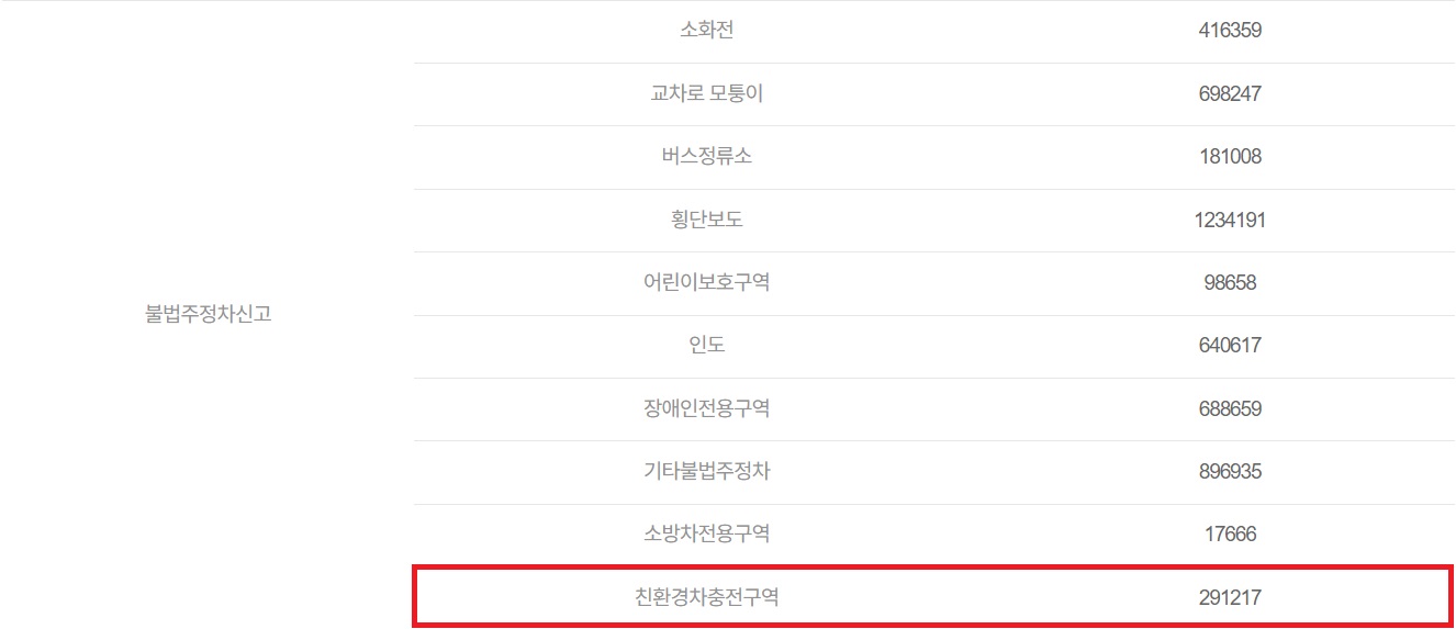 안전신문고에 따르면 최근 1년간 불법주정차 신고 통계 중 약 29만건의 친환경차 충전 구역 신고가 접수됐다. 친환경차 충전 구역의 불법주정차에는 전기차 충전 구역에 주차한 내연기관차, 충전이 완료된 후에도 계속해서 주차해 둔 전기차 등이 속한다. 행정안전부에서는 불법 주·정차 행위를 안전신문고 앱으로 신고하면 과태료를 부과할 수 있도록 시스템을 구축하고, 안전신문고 앱으로만 사진 촬영 후 신고가 가능하도록 운영하고 있다. 일반 사진의 경우 위·변조가 가능하기 때문이다. 그러나 안전신문고 외에도 지역별로 주민신고제 등을 운영하고 있어 실제로는 위 통계수치보다 더 늘어날 가능성이 있다.