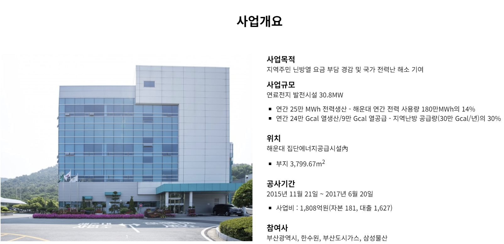 부산그린에너지(주)는 30.8MW급의 연료전지 발전시설을 운영하고 있다. 연간 해운대의 연간 전력 사용량 14%를 차지하는 25만 MWh의 전력을 생산하며, 이와 동시에 연간 24만 Gcal의 열을 생산해 지역난방의 30%를 공급하고 있다. 이 덕분에 해운대그린시티 아파트의 난방비가 절감되고, 일반 도시가스 보일러를 사용할 때보다 이산화탄소 발생 역시 약 50% 정도 감소한다.