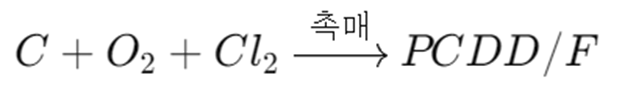다이옥신류가 형성되는 메커니즘을 보면, 주로 유기 탄소와 구리(Cu) 등 금속 촉매가 반응해 형성된다(De Novo 합성). 금속으로 인해 산소와의 반응이 촉진된 폴리염화비페닐(PCB) 등 염소화 화합물이 분해되면서 다이옥신이 생성되는 것이다. 이는 주로 200~450°C의 중온 구간에서 특히 활발하며, 급속 냉각이 없을 경우 더 많은 양이 형성된다.