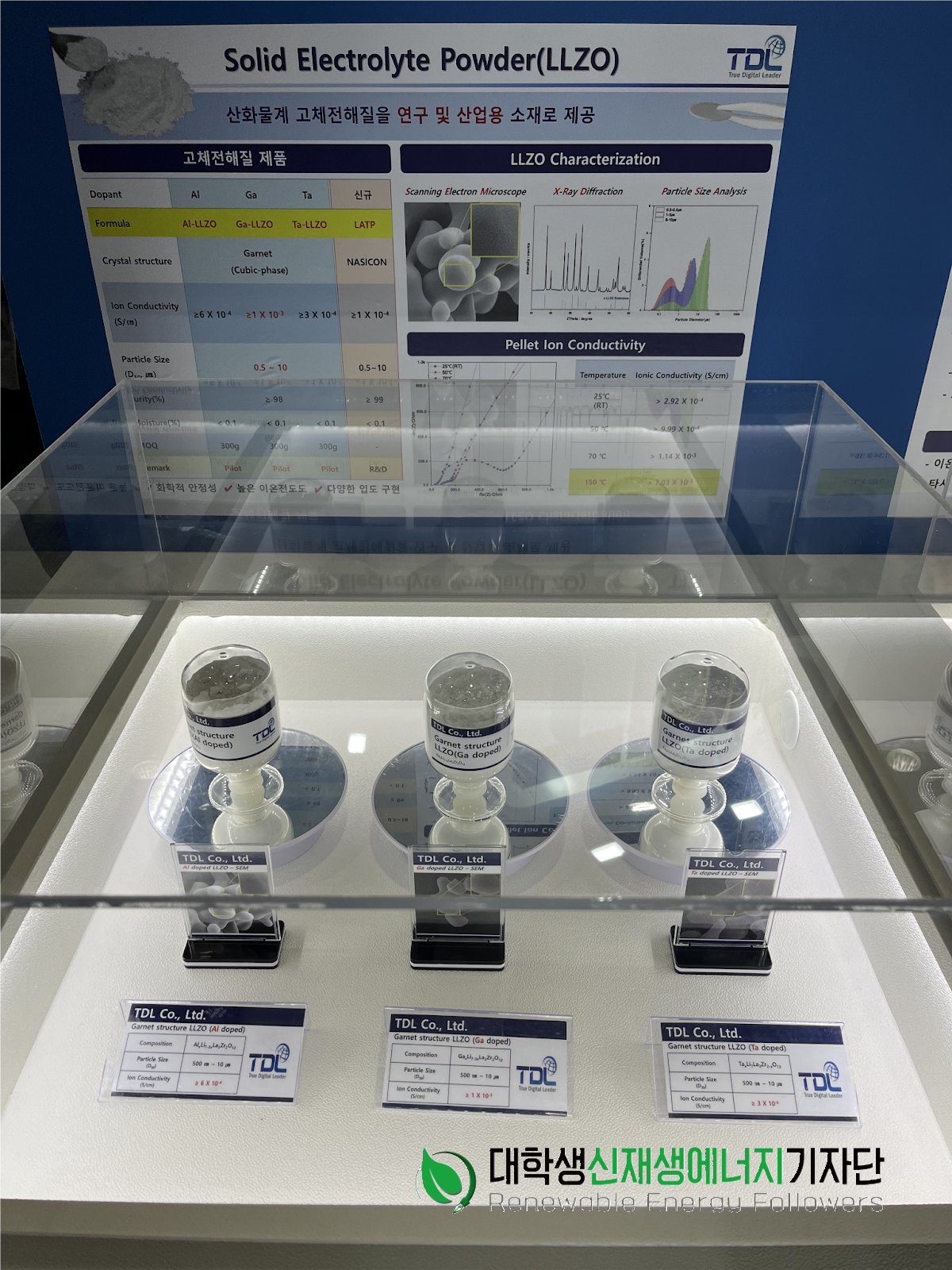 TDL은 전고체 배터리 및 고체 전해질 개발을 전문하는 기업으로, 배터리 소재 기술을 선보이며 주목받았다. 특히 산화물계 고체 전해질 양산과 관련된 기술을 공개했다. 전고체 배터리의 핵심 소재인 LLZO 기반 고체 전해질을 개발하고 있으며, 기존 제조 방식과 차별화된 기술을 중심으로 선보였다. 또한 단순히 고체 전해질뿐만 아니라, 하이브리드 고체 전해질 시트, 양극과 음극 시트를 전시하며 전고체 배터리의 전반적인 소재 솔루션을 제시했다. TDL은 전고체 배터리 상용화에 대한 비전을 더욱 확고히 하며, 차세대 배터리 시장에서의 경쟁력을 강화할 것으로 기대된다.