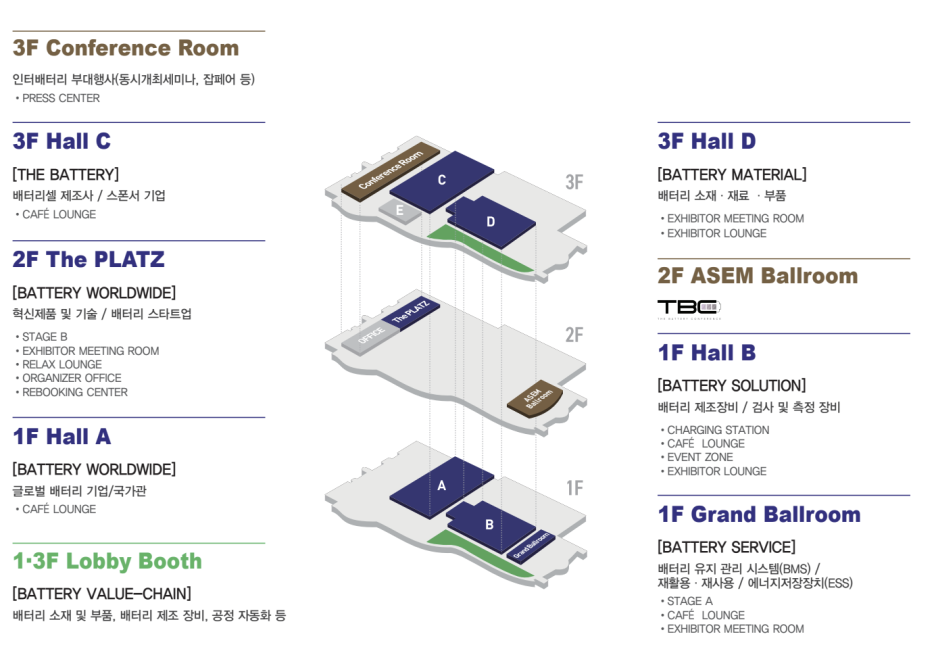 작년과의 행사장 내부 부스배치도를 비교하면 이번 인터배터리 2025에서는 배터리의 재사용·재활용 부문의 중요성을 높게 평가한 것으로 보였다. 작년 인터배터리에서는 부스배치도에 BMS, 재사용·재활용에 대한 별도의 안내가 없었지만, 올해는 Grand Ballroom 공간과 함께 새로 등장했다. 전시품목은 2024년과 2025년 모두 재사용·재활용이 포함됐지만, 이를 위한 부스를 따로 배치한 점은 관객들이나 기업의 주목을 받을 수 있도록 유도한 것으로 예상된다.