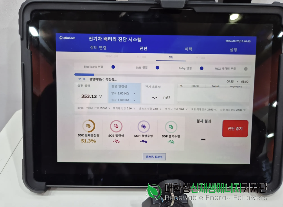 부스에서 전시 중인 태블릿 화면에서 실시간으로 전기차 배터리를 5분 동안 진단하는 과정을 보여주고 있었다. 앞서 설명한 것과 동일하게 배터리의 저항을 측정해 배터리의 충전상태와 밸런싱상태, 잔존수명, 출력수명을 확인할 수 있었다.