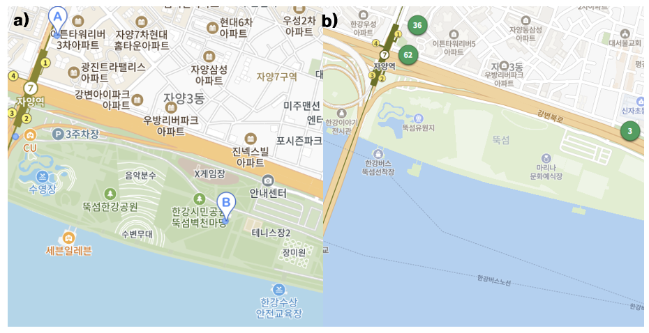 [자료 6. 뚝섬한강공원의 자전거 대여소(a)와 따릉이 대여소(b)]