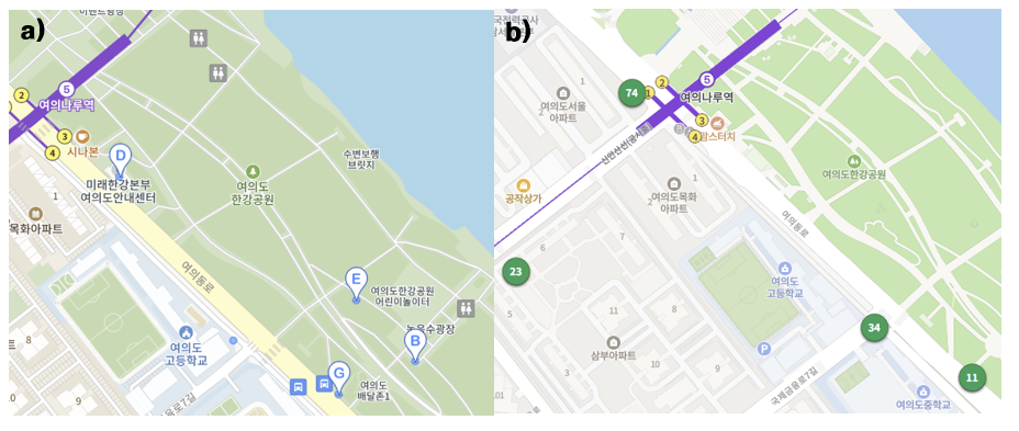 [자료 8. 여의도 한강공원의 자전거 대여소(a)와 따릉이 대여소(b)]