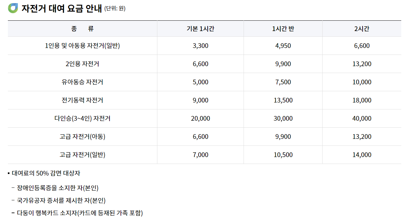 1) 미래한강본부-시민활동지원과 ,한강공원, "자전거대여점", 2022.12.13, https://hangang.seoul.go.kr/www/contents/758.do?mid=508