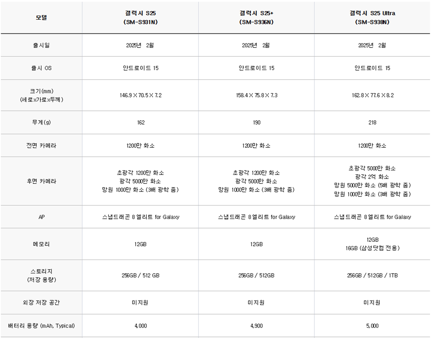 1) 삼성전자서비스, SAMSAUNG, "갤럭시 S25/S25+/S25 Ultra, 사양(스펙) 및 기능이 궁금합니다", 2025.01.23, https://www.samsungsvc.co.kr/solution/3187302